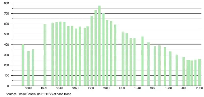 L'évolution du nombre d'habitants est connue à travers les recensements de la population effectués dans la commune depuis 1793. Pour les communes de moins de 10 000 habitants, une enquête de recensement portant sur toute la population est réalisée tous les cinq ans, les populations légales des années intermédiaires étant quant à elles estimées par interpolation ou extrapolation[13]. Pour la commune, le premier recensement exhaustif entrant dans le cadre du nouveau dispositif a été réalisé en 2004[14].