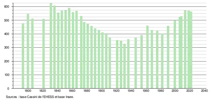 L'évolution du nombre d'habitants est connue à travers les recensements de la population effectués dans la commune depuis 1793. Pour les communes de moins de 10 000 habitants, une enquête de recensement portant sur toute la population est réalisée tous les cinq ans, les populations légales des années intermédiaires étant quant à elles estimées par interpolation ou extrapolation[33]. Pour la commune, le premier recensement exhaustif entrant dans le cadre du nouveau dispositif a été réalisé en 2008[34].