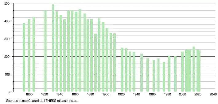 L'évolution du nombre d'habitants est connue à travers les recensements de la population effectués dans la commune depuis 1793. Pour les communes de moins de 10 000 habitants, une enquête de recensement portant sur toute la population est réalisée tous les cinq ans, les populations légales des années intermédiaires étant quant à elles estimées par interpolation ou extrapolation[23]. Pour la commune, le premier recensement exhaustif entrant dans le cadre du nouveau dispositif a été réalisé en 2004[24].