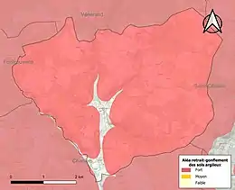 Le retrait-gonflement des sols argileux est susceptible d'engendrer des dommages importants aux bâtiments en cas d’alternance de périodes de sécheresse et de pluie. 95,9 % de la superficie communale est en aléa moyen ou fort (54,2 % au niveau départemental et 48,5 % au niveau national). Sur les 408 bâtiments dénombrés sur la commune en 2019, 299 sont en aléa moyen ou fort, soit 73 %, à comparer aux 57 % au niveau départemental et 54 % au niveau national. Une cartographie de l'exposition du territoire national au retrait gonflement des sols argileux est disponible sur le site du BRGM[13],[Carte 2].