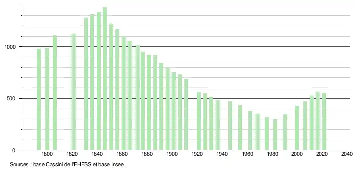 L'évolution du nombre d'habitants est connue à travers les recensements de la population effectués dans la commune depuis 1793. Pour les communes de moins de 10 000 habitants, une enquête de recensement portant sur toute la population est réalisée tous les cinq ans, les populations légales des années intermédiaires étant quant à elles estimées par interpolation ou extrapolation[24]. Pour la commune, le premier recensement exhaustif entrant dans le cadre du nouveau dispositif a été réalisé en 2006[25].