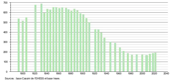 L'évolution du nombre d'habitants est connue à travers les recensements de la population effectués dans la commune depuis 1793. Pour les communes de moins de 10 000 habitants, une enquête de recensement portant sur toute la population est réalisée tous les cinq ans, les populations légales des années intermédiaires étant quant à elles estimées par interpolation ou extrapolation[16]. Pour la commune, le premier recensement exhaustif entrant dans le cadre du nouveau dispositif a été réalisé en 2007[17].