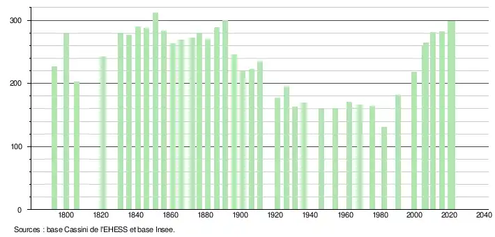 L'évolution du nombre d'habitants est connue à travers les recensements de la population effectués dans la commune depuis 1793. Pour les communes de moins de 10 000 habitants, une enquête de recensement portant sur toute la population est réalisée tous les cinq ans, les populations légales des années intermédiaires étant quant à elles estimées par interpolation ou extrapolation[19]. Pour la commune, le premier recensement exhaustif entrant dans le cadre du nouveau dispositif a été réalisé en 2005[20].