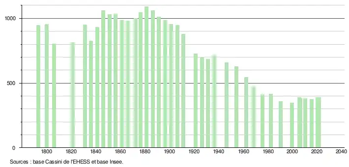 L'évolution du nombre d'habitants est connue à travers les recensements de la population effectués dans la commune depuis 1793. Pour les communes de moins de 10 000 habitants, une enquête de recensement portant sur toute la population est réalisée tous les cinq ans, les populations légales des années intermédiaires étant quant à elles estimées par interpolation ou extrapolation[37]. Pour la commune, le premier recensement exhaustif entrant dans le cadre du nouveau dispositif a été réalisé en 2005[38].