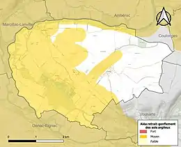 Le retrait-gonflement des sols argileux est susceptible d'engendrer des dommages importants aux bâtiments en cas d’alternance de périodes de sécheresse et de pluie. 63,8 % de la superficie communale est en aléa moyen ou fort (67,4 % au niveau départemental et 48,5 % au niveau national). Sur les 121 bâtiments dénombrés sur la commune en 2019, 96 sont en aléa moyen ou fort, soit 79 %, à comparer aux 81 % au niveau départemental et 54 % au niveau national. Une cartographie de l'exposition du territoire national au retrait gonflement des sols argileux est disponible sur le site du BRGM[20],[Carte 3].
