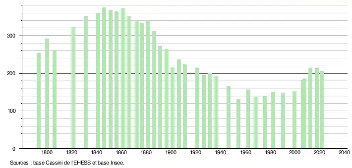 L'évolution du nombre d'habitants est connue à travers les recensements de la population effectués dans la commune depuis 1793. Pour les communes de moins de 10 000 habitants, une enquête de recensement portant sur toute la population est réalisée tous les cinq ans, les populations légales des années intermédiaires étant quant à elles estimées par interpolation ou extrapolation[29]. Pour la commune, le premier recensement exhaustif entrant dans le cadre du nouveau dispositif a été réalisé en 2007[30].