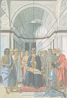 Toutes les têtes des personnages saints sont sur un même axe horizontal (principe d’isocéphalie), celui-là même de l'horizon perspectif contenant le point de fuite central, confondu avec le regard de la Vierge, au niveau des saints entourant la Vierge, organisation très novatrice pour l'époque[1]. L'axe vertical (œuf, nombril du Christ) rééquilibre l'axe horizontal précédent.