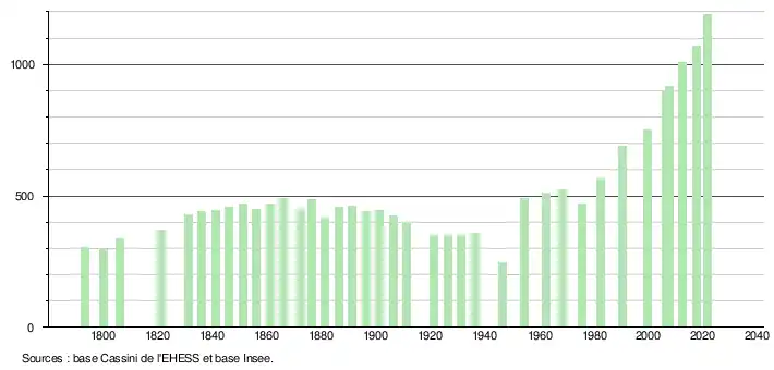 L'évolution du nombre d'habitants est connue à travers les recensements de la population effectués dans la commune depuis 1793. Pour les communes de moins de 10 000 habitants, une enquête de recensement portant sur toute la population est réalisée tous les cinq ans, les populations légales des années intermédiaires étant quant à elles estimées par interpolation ou extrapolation[19]. Pour la commune, le premier recensement exhaustif entrant dans le cadre du nouveau dispositif a été réalisé en 2007[20].