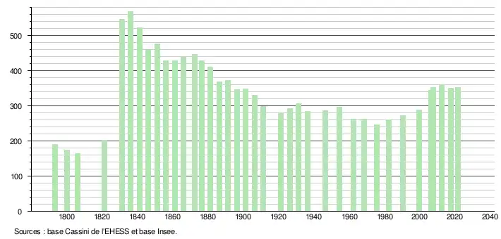 L'évolution du nombre d'habitants est connue à travers les recensements de la population effectués dans la commune depuis 1793. Pour les communes de moins de 10 000 habitants, une enquête de recensement portant sur toute la population est réalisée tous les cinq ans, les populations légales des années intermédiaires étant quant à elles estimées par interpolation ou extrapolation[20]. Pour la commune, le premier recensement exhaustif entrant dans le cadre du nouveau dispositif a été réalisé en 2007[21].