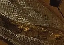 Elle a, autour du cou comme aux deux poignets, des bijoux composés de rangées de petites perles de jais, comme ceux de La Femme à la puce du musée de Nancy[10]. Son élégant et riche corsage de résille, ou tulle d'or et d'argent brodée en losanges encadrant des motifs floraux, laisse plus transparaître la nudité de sa peau qu'elle ne la cache. Sur un corselet bleu-vert sombre, se terminant par des manches bouffantes de satin blanc agrémentées de broderies bleues et rouge orangé, elle porte, elle aussi, un manteau de gitane attaché à l'épaule, marron, avec les traditionnelles rayures, ici jaunes[4].