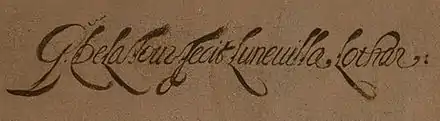 L'élégante et très visible signature calligraphiée, rédigée en latin, qui se détache sur le mur du fond : « G. De La Tour Fecit Lunevillæ Lothar : », a été diversement interprétée.