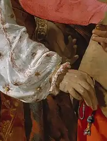 Si sa main gauche est cachée par le jeune homme, l’œil du spectateur est attiré vers sa main droite, pourtant dans l'ombre et dans la partie inférieure de la toile, en raison de la riche et large bande brodée d'or qui en orne le poignet : les doigts à demi repliés, révélés par des points de lumière déposés à leur bout, elle avance la paume vers sa complice pour récupérer le butin.