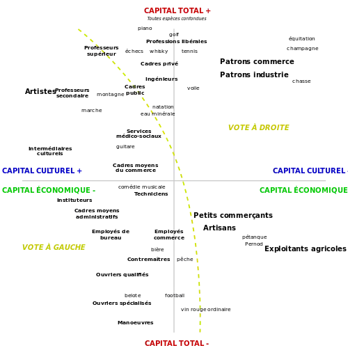 Bourdieu classe les agents sociaux à l'intérieur d'un espace social des positions relatives. Cet espace est construit à partir d'une analyse statistique multidimensionnelle selon deux axes[3]. Le premier représente le volume global de capital qu'un agent possède, tous capitaux confondus (capital social, capital culturel, capital économique). Il croît de bas en haut. Le second axe représente le rapport entre le capital culturel et le capital économique des agents.