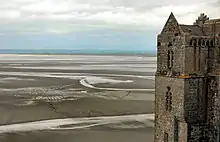 « Pour peu qu'il y ait un léger voile de brume sur le sol plat du Marais, vous ne savez de quel côté de la digue est la grève, de quel côté la terre ferme. À droite et à gauche, c'est la même intensité morne et muette. Nul mouvement de terrain n'indique la campagne habitée ; vous diriez que la route court entre deux grandes mers. C'est que les choses passées ont leurs spectres comme les hommes décédés ; c'est que la nuit évoque le fantôme des mondes transformés aussi bien que les ombres humaines[12]. » Tangues, lises, paumelles[13], danger du flot qui monte, soudaineté des fantaisies du Couesnon, villages ensevelis, brouillards de grève, mer de vapeurs, dorures du soleil sur le Mont dans les « vagues cotonneuses[14] » de la brume : la description des féeries de la baie du mont Saint-Michel fait baigner le récit dans une atmosphère de sortilèges.