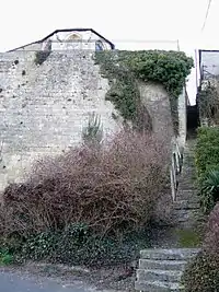 En contrebas de l'église dont on aperçoit une partie du chevet, la falaise est maintenue par un haut mur percé par un escalier raide et étroit que l'on remarque à droite.