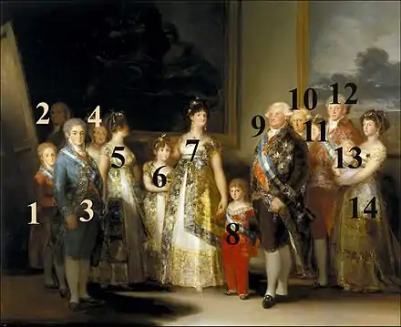 (1) Charles de Bourbon (1788–1855) ; (3) Futur Ferdinand VII d'Espagne (1784–1833) ; (4) Marie-Josèphe d'Espagne (1744–1801), sœur de Charles IV ; (5) Future femme de Ferdinand, alors inconnue à l'époque ; (6) Marie-Isabelle d'Espagne (1789–1848) ; (7) Marie-Louise de Bourbon-Parme (1751–1819) ; (8) François de Paule (1794–1848); (9) Charles IV (1748–1819) ; (10) Antoine Pascal de Bourbon, frère du roi (1755–1817) ; (11) Charlotte-Joachime d'Espagne (1775–1830, infante du Portugal dont seule une partie de la tête est visible) ; (12) Louis Ier d'Étrurie (1773–1803) et (14) sa femme Marie Louise (1782–1824), tenant dans ses bras (13) son fils Charles Louis (1799–1883), futur duc de Parme[18],[19].