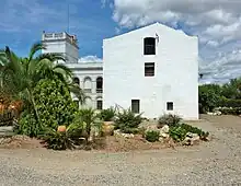 Le bâtiment principal de la ferme. Il est de couleur brun clair. Les fenêtres, la porte, la potence de levage et les lézardes des murs sont représentées. Au travers de la porte ouverte, on note l'arrière-train d'un cheval. Au premier plan devant le bâtiment, les éléments suivants sont représentés de haut en bas : sillons, une hache, un seau, un plant de tomate au premier plan.