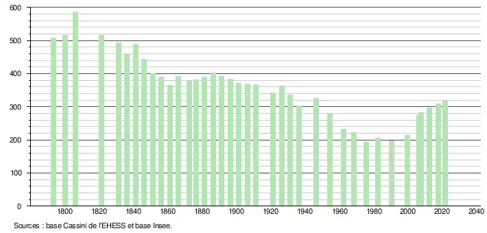 L'évolution du nombre d'habitants est connue à travers les recensements de la population effectués dans la commune depuis 1793. Pour les communes de moins de 10 000 habitants, une enquête de recensement portant sur toute la population est réalisée tous les cinq ans, les populations légales des années intermédiaires étant quant à elles estimées par interpolation ou extrapolation[25]. Pour la commune, le premier recensement exhaustif entrant dans le cadre du nouveau dispositif a été réalisé en 2007[26].