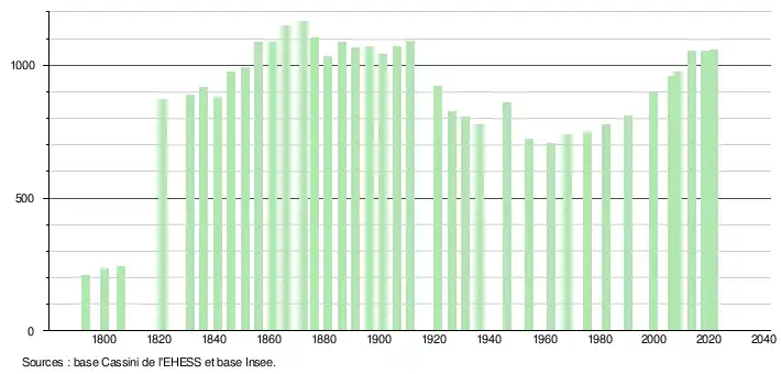 L'évolution du nombre d'habitants est connue à travers les recensements de la population effectués dans la commune depuis 1793. Pour les communes de moins de 10 000 habitants, une enquête de recensement portant sur toute la population est réalisée tous les cinq ans, les populations légales des années intermédiaires étant quant à elles estimées par interpolation ou extrapolation[58]. Pour la commune, le premier recensement exhaustif entrant dans le cadre du nouveau dispositif a été réalisé en 2008[59].