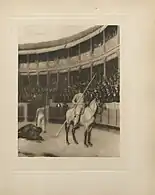 Le tableau représente une arène avec plusieurs chevaux allongés, blessés au combat, ainsi que plusieurs chevaux debout. Un taureau est aussi couché à proximité du trio de chevaux. Le sang est complètement absent du tableau.