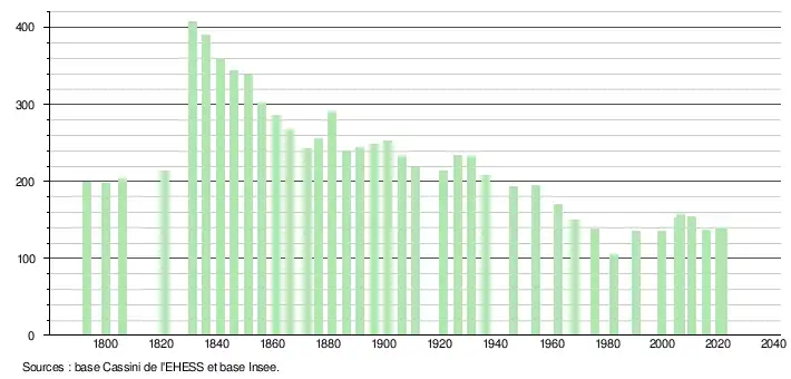 L'évolution du nombre d'habitants est connue à travers les recensements de la population effectués dans la commune depuis 1793. Pour les communes de moins de 10 000 habitants, une enquête de recensement portant sur toute la population est réalisée tous les cinq ans, les populations légales des années intermédiaires étant quant à elles estimées par interpolation ou extrapolation[20]. Pour la commune, le premier recensement exhaustif entrant dans le cadre du nouveau dispositif a été réalisé en 2005[21].