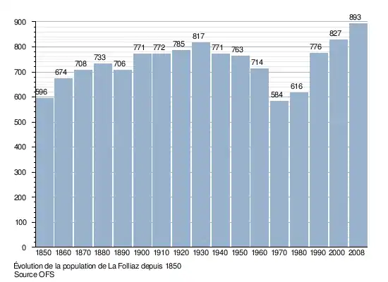 Le graphique suivant résume l'évolution de la population de La Folliaz (incluant les communes fusionnées ultérieurement) entre 1850 et 2008[4] :