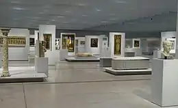 « Aux origines de l'empire byzantin : naissance d'un art chrétien d'Orient »[LL 81] regroupe Prince de la famille de l'empereur d'Orient Théodore II (408-450)[LL 82], Décor d'architecture funéraire : poisson à la croix, symbole de Jésus-Christ[LL 83], Pilier d'angle à décor de saint, archange et rinceaux, Stèle funéraire de Théodore gravée d'une croix et d'un texte en langue copte[LL 84] et Médaillon central d'une grande croix de procession : Christ bénissant[LL 85].