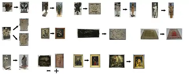 Pour la période s'étalant du 4 décembre 2013 au 3 décembre 2014, treize œuvres ont été remplacées par quatorze autres[9]. Ainsi, il y a notamment un décalage dans la numérotation du catalogue d'exposition. Le changement le plus visible est le remplacement de La Liberté guidant le peuple par Œdipe et le Sphinx, nouvelle « figure de proue de La Galerie du temps »[10].