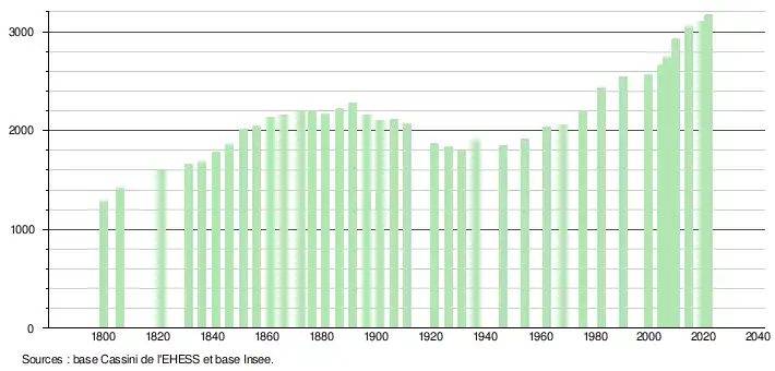 L'évolution du nombre d'habitants est connue à travers les recensements de la population effectués dans la commune depuis 1800. Pour les communes de moins de 10 000 habitants, une enquête de recensement portant sur toute la population est réalisée tous les cinq ans, les populations légales des années intermédiaires étant quant à elles estimées par interpolation ou extrapolation[24]. Pour la commune, le premier recensement exhaustif entrant dans le cadre du nouveau dispositif a été réalisé en 2004[25].