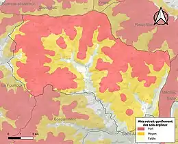 Le retrait-gonflement des sols argileux est susceptible d'engendrer des dommages importants aux bâtiments en cas d’alternance de périodes de sécheresse et de pluie. 89 % de la superficie communale est en aléa moyen ou fort (54,2 % au niveau départemental et 48,5 % au niveau national). Sur les 170 bâtiments dénombrés sur la commune en 2019, 169 sont en aléa moyen ou fort, soit 99 %, à comparer aux 57 % au niveau départemental et 54 % au niveau national. Une cartographie de l'exposition du territoire national au retrait gonflement des sols argileux est disponible sur le site du BRGM[16],[Carte 2].
