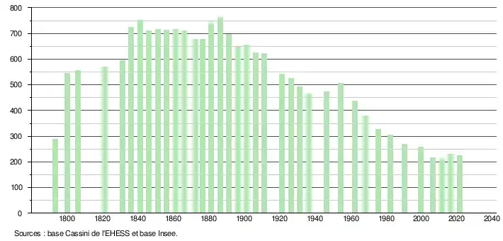 L'évolution du nombre d'habitants est connue à travers les recensements de la population effectués dans la commune depuis 1793. Pour les communes de moins de 10 000 habitants, une enquête de recensement portant sur toute la population est réalisée tous les cinq ans, les populations légales des années intermédiaires étant quant à elles estimées par interpolation ou extrapolation[19]. Pour la commune, le premier recensement exhaustif entrant dans le cadre du nouveau dispositif a été réalisé en 2006[20].