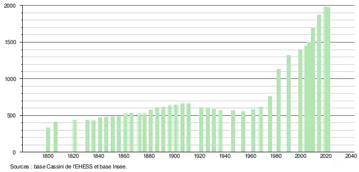 L'évolution du nombre d'habitants est connue à travers les recensements de la population effectués dans la commune depuis 1800. Pour les communes de moins de 10 000 habitants, une enquête de recensement portant sur toute la population est réalisée tous les cinq ans, les populations légales des années intermédiaires étant quant à elles estimées par interpolation ou extrapolation[23]. Pour la commune, le premier recensement exhaustif entrant dans le cadre du nouveau dispositif a été réalisé en 2004[24].