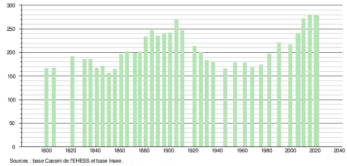 L'évolution du nombre d'habitants est connue à travers les recensements de la population effectués dans la commune depuis 1800. Pour les communes de moins de 10 000 habitants, une enquête de recensement portant sur toute la population est réalisée tous les cinq ans, les populations légales des années intermédiaires étant quant à elles estimées par interpolation ou extrapolation[18]. Pour la commune, le premier recensement exhaustif entrant dans le cadre du nouveau dispositif a été réalisé en 2005[19].