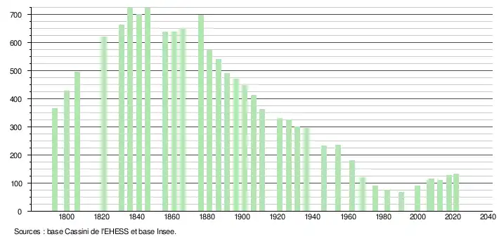 L'évolution du nombre d'habitants est connue à travers les recensements de la population effectués dans la commune depuis 1793. Pour les communes de moins de 10 000 habitants, une enquête de recensement portant sur toute la population est réalisée tous les cinq ans, les populations légales des années intermédiaires étant quant à elles estimées par interpolation ou extrapolation[20]. Pour la commune, le premier recensement exhaustif entrant dans le cadre du nouveau dispositif a été réalisé en 2007[21].