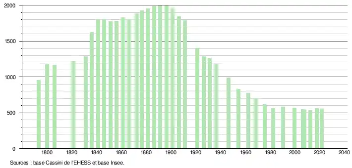 L'évolution du nombre d'habitants est connue à travers les recensements de la population effectués dans la commune depuis 1793. Pour les communes de moins de 10 000 habitants, une enquête de recensement portant sur toute la population est réalisée tous les cinq ans, les populations légales des années intermédiaires étant quant à elles estimées par interpolation ou extrapolation[26]. Pour la commune, le premier recensement exhaustif entrant dans le cadre du nouveau dispositif a été réalisé en 2007[27].