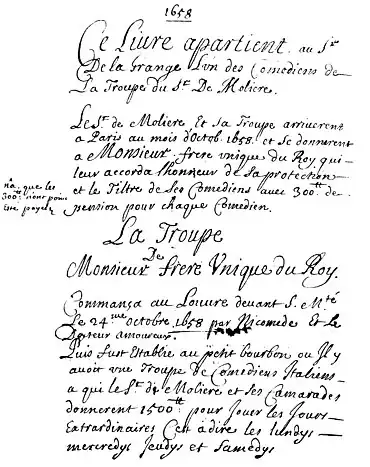 Ce qu'il est convenu, depuis le XIXe siècle, d'appeler "le Registre de La Grange"[13] est un cahier manuscrit de 359 pages, qui permet de suivre jour après jour l’activité de la troupe de Molière, puis de la Comédie-Française, de 1659 à 1685. Le comédien indique, pour chaque jour de représentation, le titre de la (ou des) pièces représentée(s), la recette et la « part » qui en revient à chaque acteur, une fois déduits les frais ordinaires ou extraordinaires ; il dresse le bilan financier de l’année à la fin de chaque saison théâtrale, au moment du relâche de Pâques, et il fournit la liste des acteurs présents dans la troupe au commencement de chaque nouvelle saison (sauf lorsqu'il n'y a pas eu de changement) ; il ajoute enfin des informations sur la vie de la troupe (décès, mariages, représentations données chez des particuliers ou dans les résidences royales, séjours prolongés à la cour). Ce sont le plus souvent des ajouts en marge, en bas de page ou dans des blancs ; dans le cas d'événements marquants il consacre des développements de quelques lignes à une page ou deux.