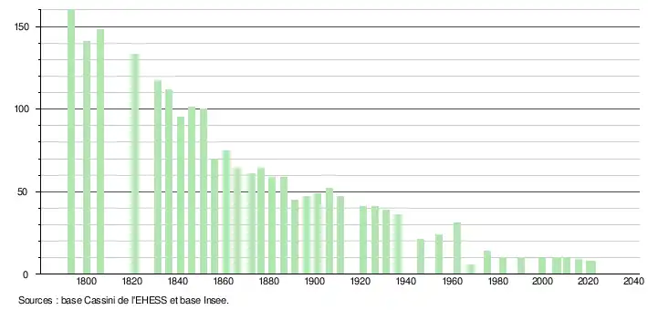 L'évolution du nombre d'habitants est connue à travers les recensements de la population effectués dans la commune depuis 1793. Pour les communes de moins de 10 000 habitants, une enquête de recensement portant sur toute la population est réalisée tous les cinq ans, les populations légales des années intermédiaires étant quant à elles estimées par interpolation ou extrapolation[21]. Pour la commune, le premier recensement exhaustif entrant dans le cadre du nouveau dispositif a été réalisé en 2005[22].