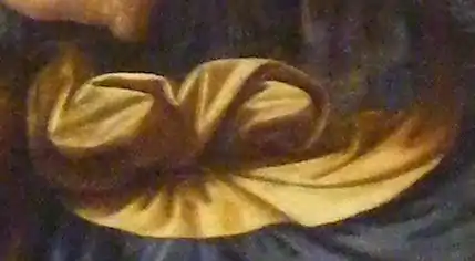Les habits de la Vierge sont très ornementés, rappelant ceux d'une reine, et sont peints avec de nombreux détails. La coiffure est également très travaillée rappelant les études de la tête de Léda menées par le maître.