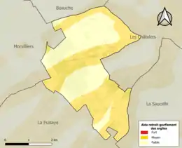 Le retrait-gonflement des sols argileux est susceptible d'engendrer des dommages importants aux bâtiments en cas d’alternance de périodes de sécheresse et de pluie. 56 % de la superficie communale est en aléa moyen ou fort (52,8 % au niveau départemental et 48,5 % au niveau national). Sur les 109 bâtiments dénombrés sur la commune en 2019, 65 sont en aléa moyen ou fort, soit 60 %, à comparer aux 70 % au niveau départemental et 54 % au niveau national. Une cartographie de l'exposition du territoire national au retrait gonflement des sols argileux est disponible sur le site du BRGM[19],[Carte 2].