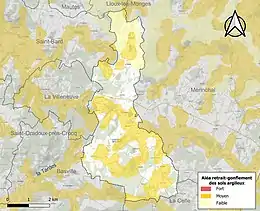 Le retrait-gonflement des sols argileux est susceptible d'engendrer des dommages importants aux bâtiments en cas d’alternance de périodes de sécheresse et de pluie. 41,2 % de la superficie communale est en aléa moyen ou fort (33,6 % au niveau départemental et 48,5 % au niveau national). Sur les 53 bâtiments dénombrés sur la commune en 2019, 27 sont en aléa moyen ou fort, soit 51 %, à comparer aux 25 % au niveau départemental et 54 % au niveau national. Une cartographie de l'exposition du territoire national au retrait gonflement des sols argileux est disponible sur le site du BRGM[16],[Carte 2].