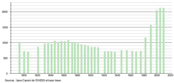 L'évolution du nombre d'habitants est connue à travers les recensements de la population effectués dans la commune depuis 1793. À partir du , les populations légales des communes sont publiées annuellement dans le cadre d'un recensement qui repose désormais sur une collecte d'information annuelle, concernant successivement tous les territoires communaux au cours d'une période de cinq ans. Pour les communes de moins de 10 000 habitants, une enquête de recensement portant sur toute la population est réalisée tous les cinq ans, les populations légales des années intermédiaires étant quant à elles estimées par interpolation ou extrapolation[10]. Pour la commune, le premier recensement exhaustif entrant dans le cadre du nouveau dispositif a été réalisé en 2004[11],[Note 1].