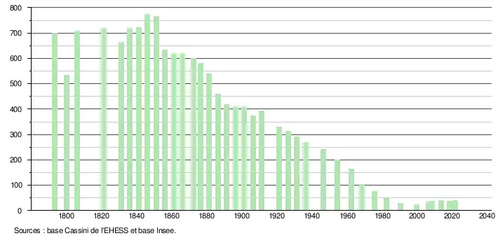 L'évolution du nombre d'habitants est connue à travers les recensements de la population effectués dans la commune depuis 1793. Pour les communes de moins de 10 000 habitants, une enquête de recensement portant sur toute la population est réalisée tous les cinq ans, les populations légales des années intermédiaires étant quant à elles estimées par interpolation ou extrapolation[23]. Pour la commune, le premier recensement exhaustif entrant dans le cadre du nouveau dispositif a été réalisé en 2008[24].