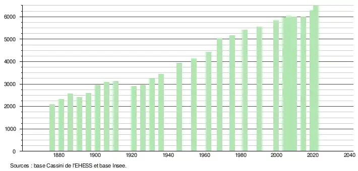 L'évolution du nombre d'habitants est connue à travers les recensements de la population effectués dans la commune depuis 1876. Pour les communes de moins de 10 000 habitants, une enquête de recensement portant sur toute la population est réalisée tous les cinq ans, les populations légales des années intermédiaires étant quant à elles estimées par interpolation ou extrapolation[40]. Pour la commune, le premier recensement exhaustif entrant dans le cadre du nouveau dispositif a été réalisé en 2004[41].