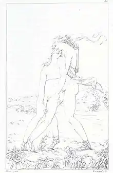 « Ce sujet (dont on a déjà donné une esquisse dans ce 2e vol. p. 23, d'après le modèle en plâtre par Callamar), représente la mort d'Hyacinthe, favori d'Apollon, jouant au palet avec ce Dieu, Le jeune homme est atteint d'un coup mortel; il expire dans les bras d'Apollon, qui le change en une fleur qui porte son nom (Voyez la page ci-dessus indiquée).