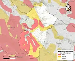 Les mouvements de terrains susceptibles de se produire sur la commune sont des tassements différentiels[18]. Le retrait-gonflement des sols argileux est susceptible d'engendrer des dommages importants aux bâtiments en cas d’alternance de périodes de sécheresse et de pluie[19]. 55,1 % de la superficie communale est en aléa moyen ou fort (54,9 % au niveau départemental et 48,5 % au niveau national)[Carte 2]. Depuis le , en application de la loi ELAN, différentes contraintes s'imposent aux vendeurs, maîtres d'ouvrages ou constructeurs de biens situés dans une zone classée en aléa moyen ou fort[Note 2],[20].