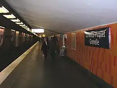 Les piédroits des couloirs de correspondance sont décorés par endroits de carrelage biseauté de couleur marron à mi-hauteur ainsi que de plusieurs blasons de la famille de Toussaint-Guillaume Picquet de La Motte (d'azur à trois chevrons d'or, accompagnés de trois fers de lance d'argent en pal les pointes en haut). Une fresque représente la barrière de la Cunette, une des portes du mur des Fermiers généraux située autrefois en ce lieu.