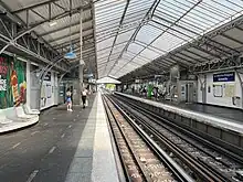 Les quais de la ligne 6 sont couverts d'une verrière dans le style des marquises des gares de l'époque. Les piédroits verticaux sont recouverts de carreaux en céramique blancs biseautés côté intérieur, et de briques dessinant des motifs géométriques côté extérieur. Les cadres publicitaires sont en céramique blanche et le nom de la station est inscrit dans la police de caractères du métro, Parisine, sur des plaques émaillées. Les sièges de style « Motte » sont blancs et disposés sur des banquettes de forme convexe recouvertes de carreaux en céramique blancs plats. L'éclairage est semi-direct, projeté au sol par des plafonniers bleus, sur les piédroits par des tubes en partie dissimulés et sur la charpente par des projecteurs de lumière bleue.