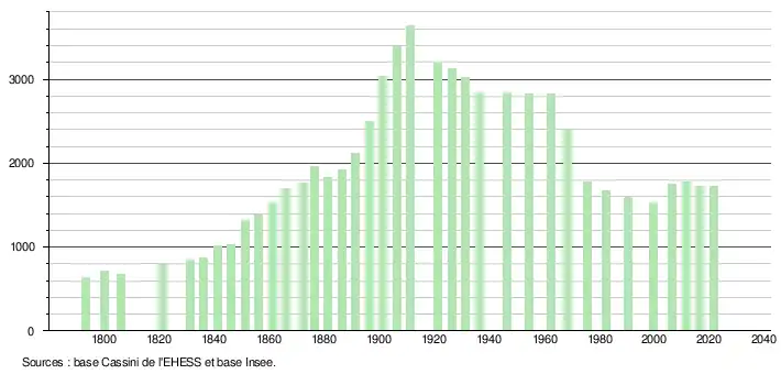 L'évolution du nombre d'habitants est connue à travers les recensements de la population effectués dans la commune depuis 1793. Pour les communes de moins de 10 000 habitants, une enquête de recensement portant sur toute la population est réalisée tous les cinq ans, les populations légales des années intermédiaires étant quant à elles estimées par interpolation ou extrapolation[19]. Pour la commune, le premier recensement exhaustif entrant dans le cadre du nouveau dispositif a été réalisé en 2006[20].