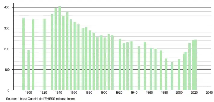 L'évolution du nombre d'habitants est connue à travers les recensements de la population effectués dans la commune depuis 1793. Pour les communes de moins de 10 000 habitants, une enquête de recensement portant sur toute la population est réalisée tous les cinq ans, les populations légales des années intermédiaires étant quant à elles estimées par interpolation ou extrapolation[23]. Pour la commune, le premier recensement exhaustif entrant dans le cadre du nouveau dispositif a été réalisé en 2008[24].