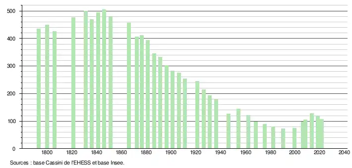 L'évolution du nombre d'habitants est connue à travers les recensements de la population effectués dans la commune depuis 1793. Pour les communes de moins de 10 000 habitants, une enquête de recensement portant sur toute la population est réalisée tous les cinq ans, les populations légales des années intermédiaires étant quant à elles estimées par interpolation ou extrapolation[18]. Pour la commune, le premier recensement exhaustif entrant dans le cadre du nouveau dispositif a été réalisé en 2008[19].